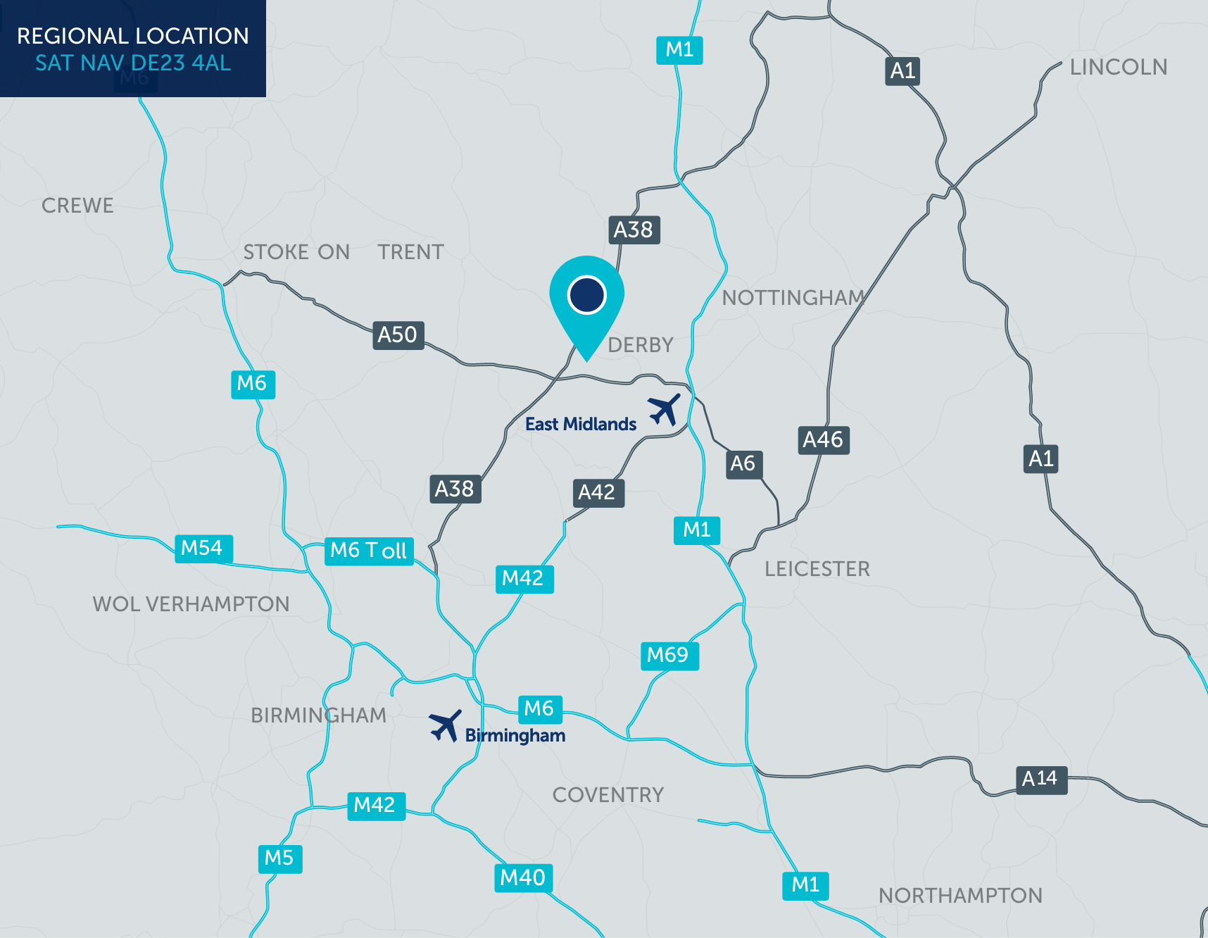 The A38/A50 junction links the site to the M1 and M6 motorways. This A50 trunk road runs from junction 24/24A of M1 to the A500 linking to junctions 15 and 16 of the M6. This opens up access to the national motorway system, major seaports and airports along with 48 million people within a 4-hour drive.